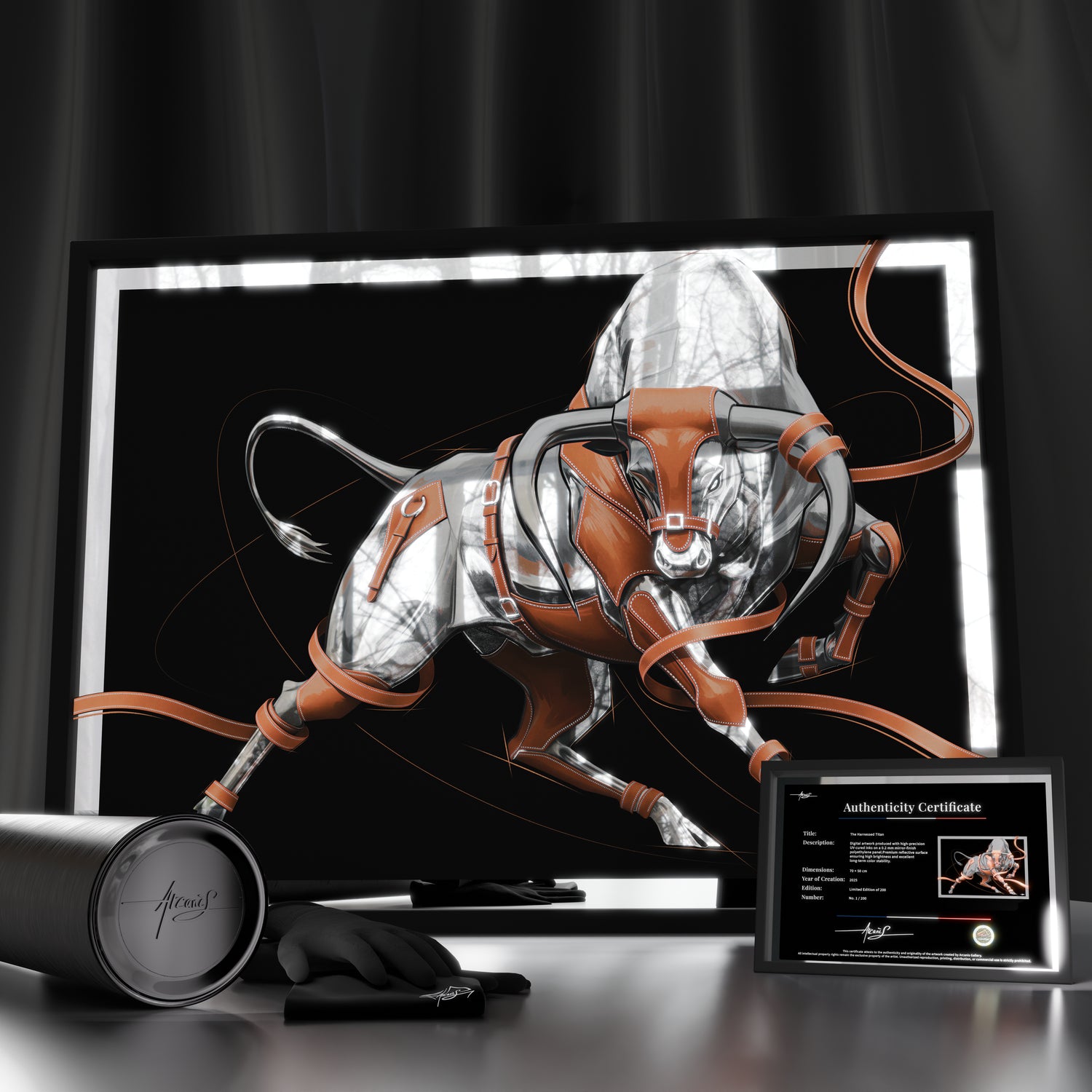 Emitida en una edición muy limitada, esta obra de arte de espejo juega con la luz y el movimiento. Numerada, firmada a mano y acompañada de un certificado de autenticidad, encarna la filosofía de Arcanis: crear piezas únicas, duraderas y atemporales.