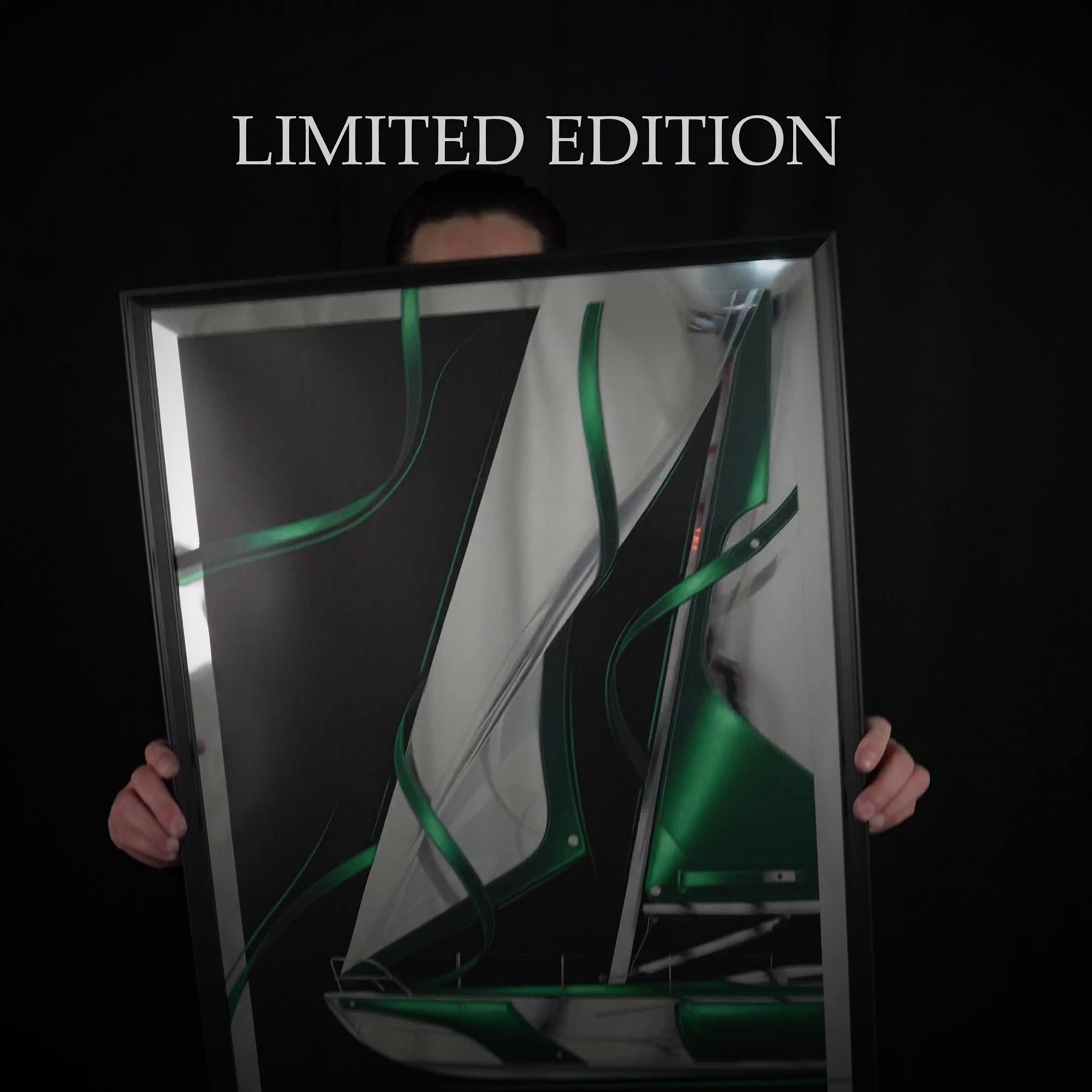Imprimé sur un support à effet miroir, numéroté individuellement, signé à la main et sécurisé par un badge holographique anti-contrefaçon.