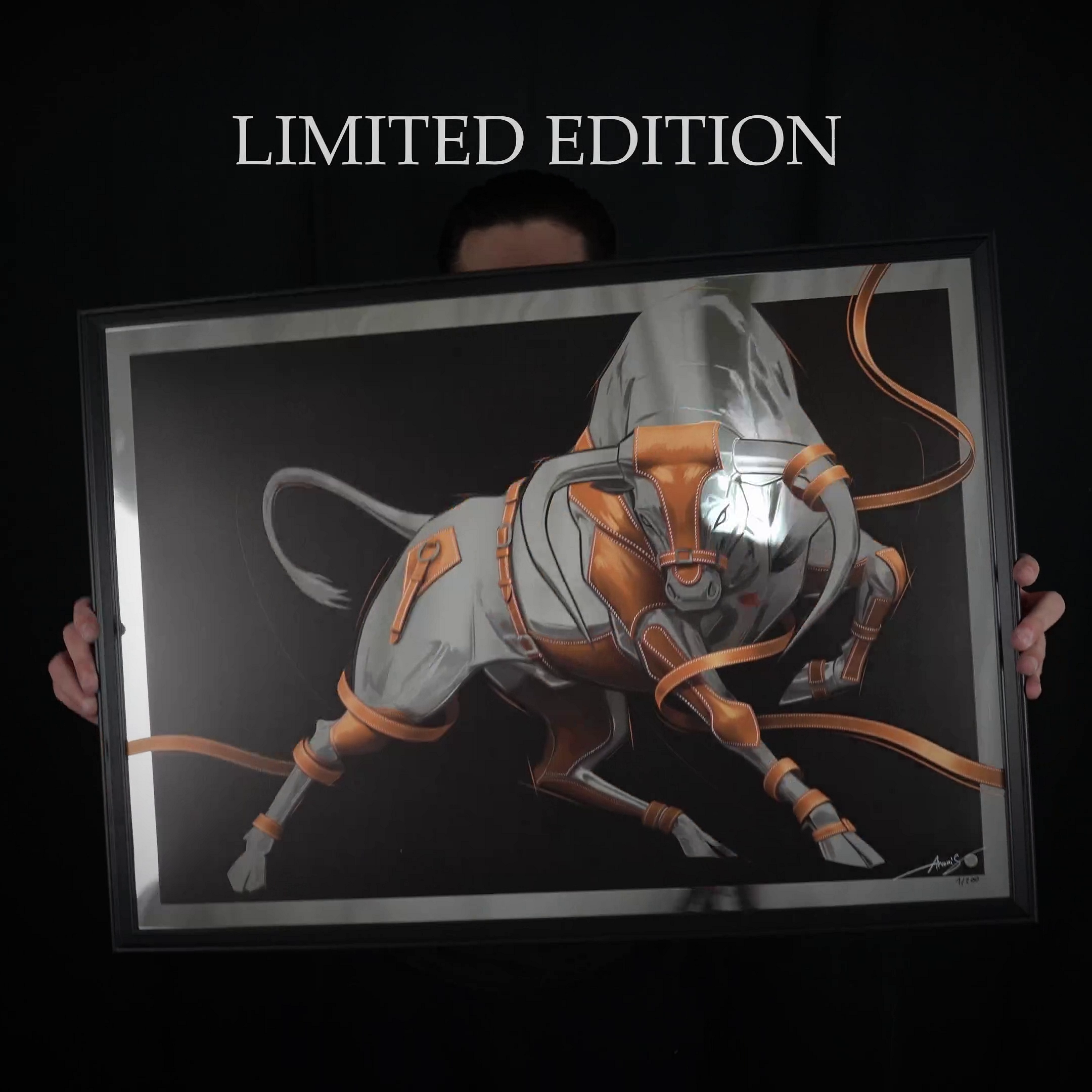 Tükörbevonatú anyagra nyomtatva, egyedileg számozva, kézzel aláírva, és hamisítás elleni holografikus jelvénnyel rögzítve.